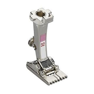Der Fuss # 32 ist mit sieben Rillen ausgestattet und eignet sich für leichte bis mittelschwere Stoffe in Kombination mit einer 2mm Zwillingsnadel. Der Fuss # 33 ist für sehr leichte Stoffe und hat neun Rillen, ideal mit der 1 oder 1.6mm Zwillingsnadel.